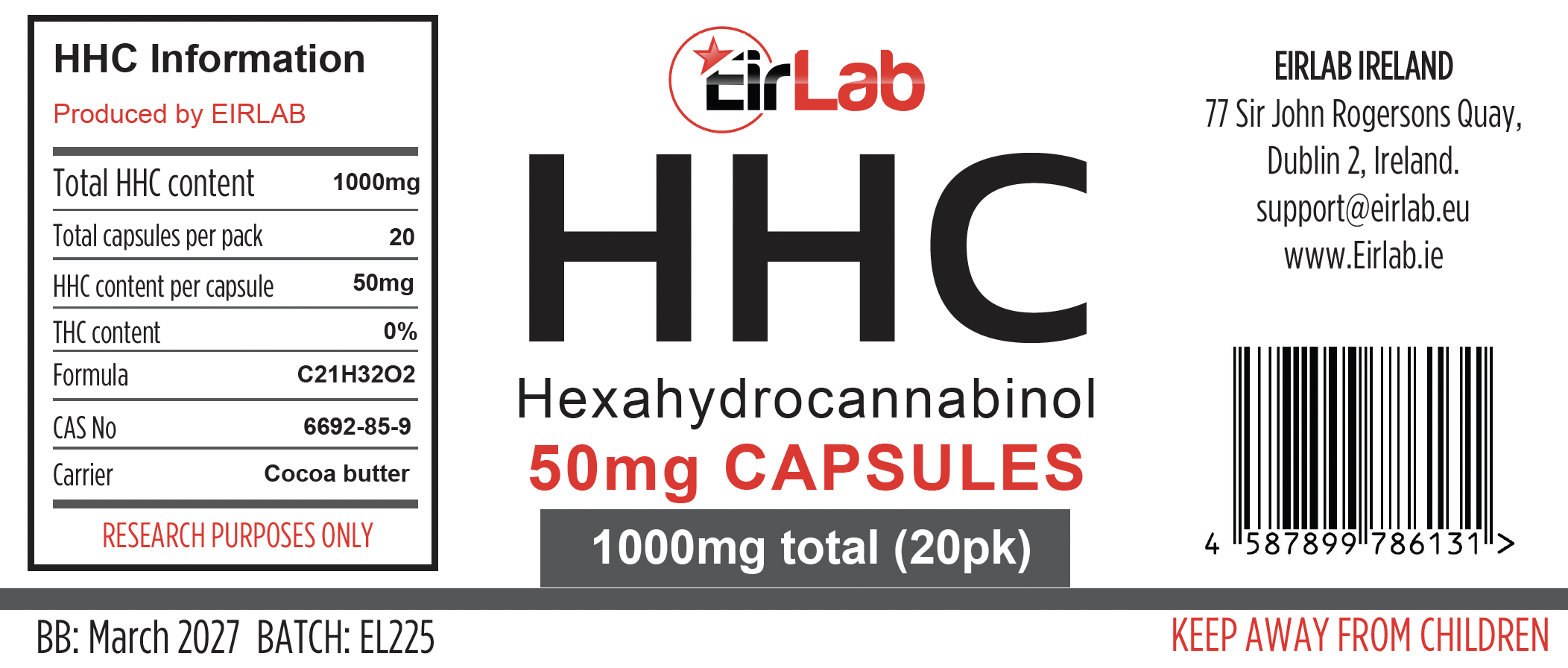 EIRLAB HHC Capsules contain a highly potent concentration of 50mg HHC per Capsule with 20 Capsules in each pack. Total 1000mg. The vegan Capsules are made with 100% natural ingredients and NO artificial flavouring or colouring are used in the production.