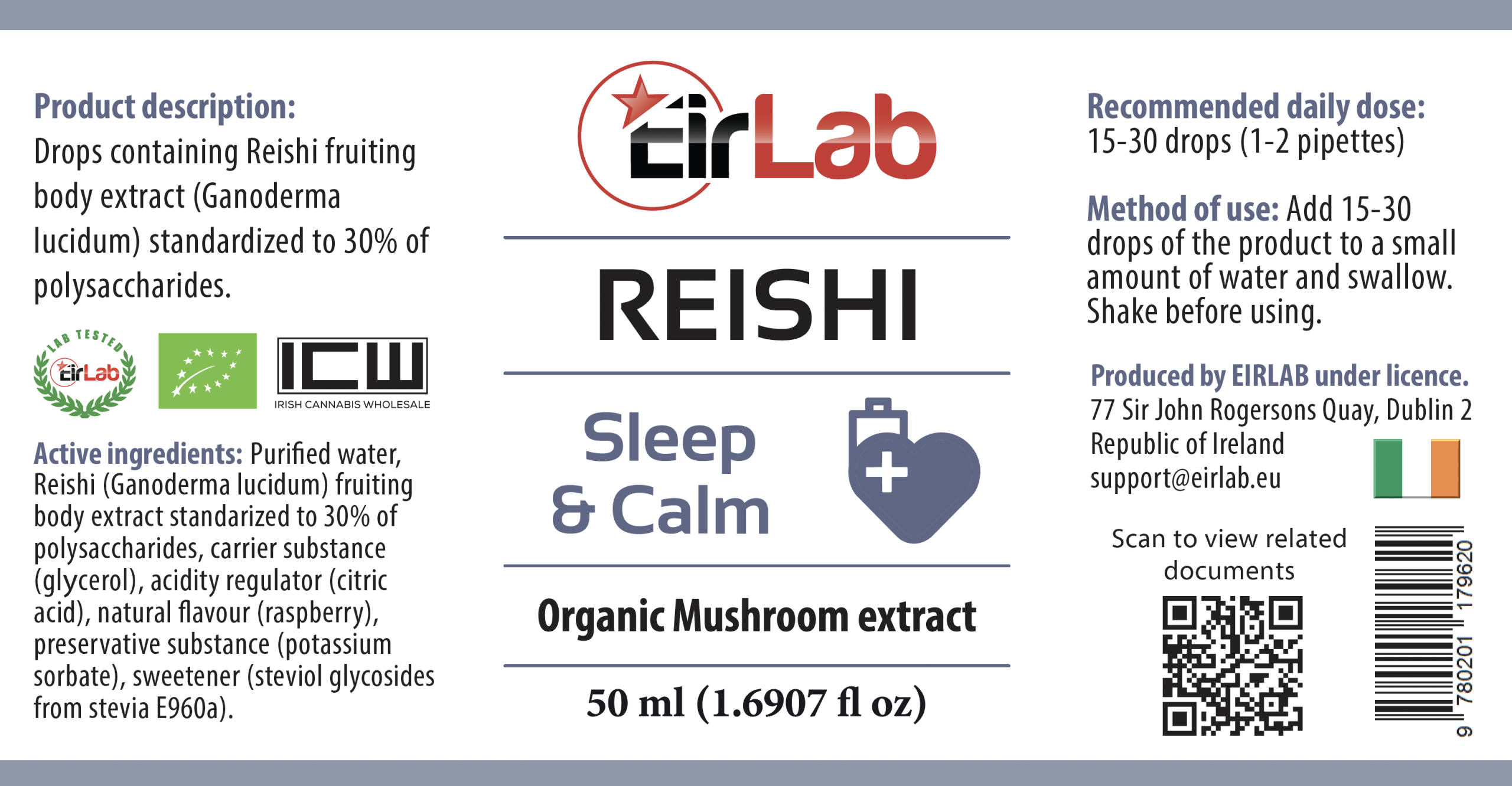 EIRLAB Reishi mushroom tincture is produced in Ireland using only organic ingredients. 100% Natural.